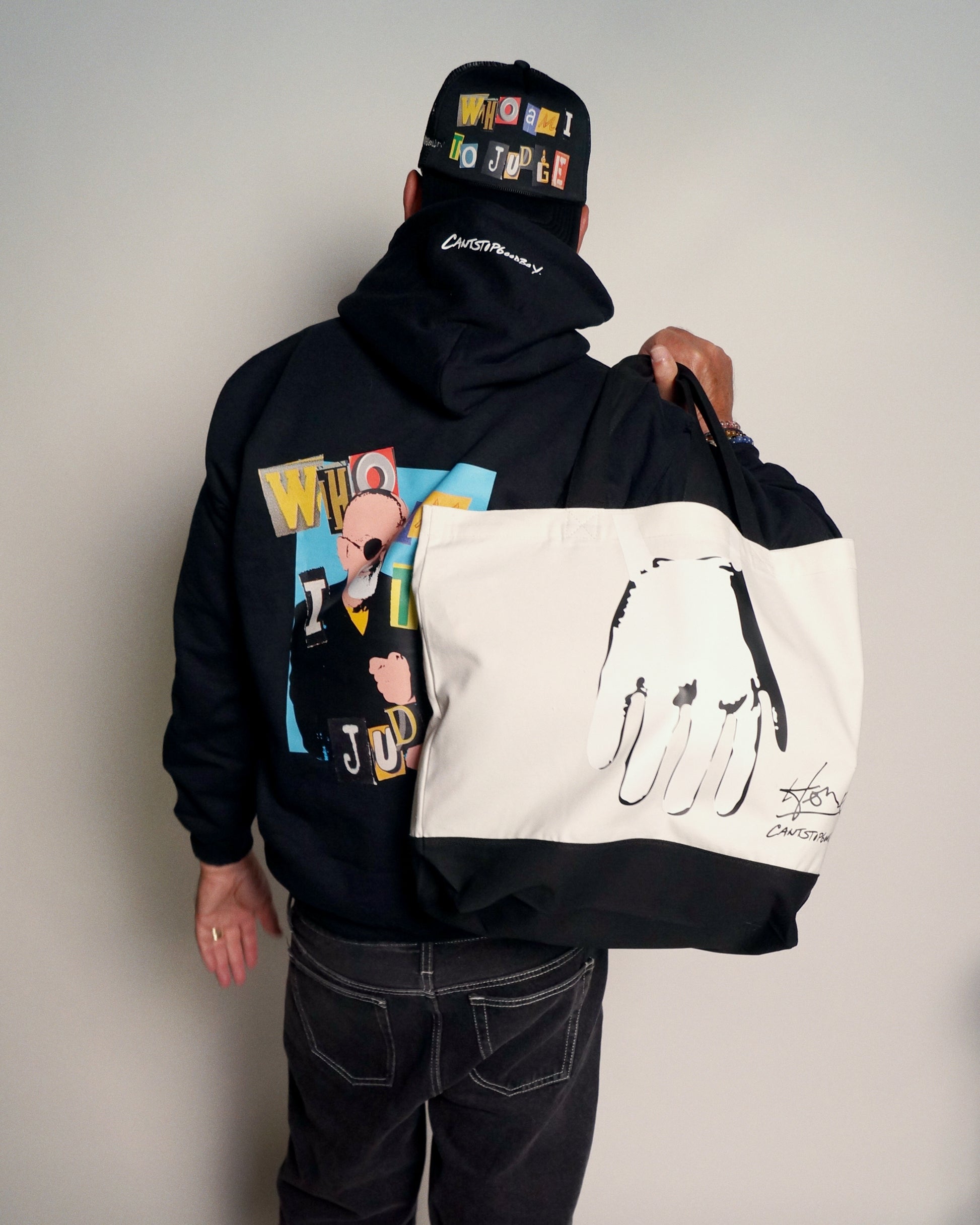 CANTSTOPGOODBOY and Howie Mandel debut their official collaboration, CANTSTOPGOODBOY for Howie Mandel. A tote bag inspired by Howie Mandel iconic hand bag skit, brought to life through the CANTSTOPGOODBOY lens.